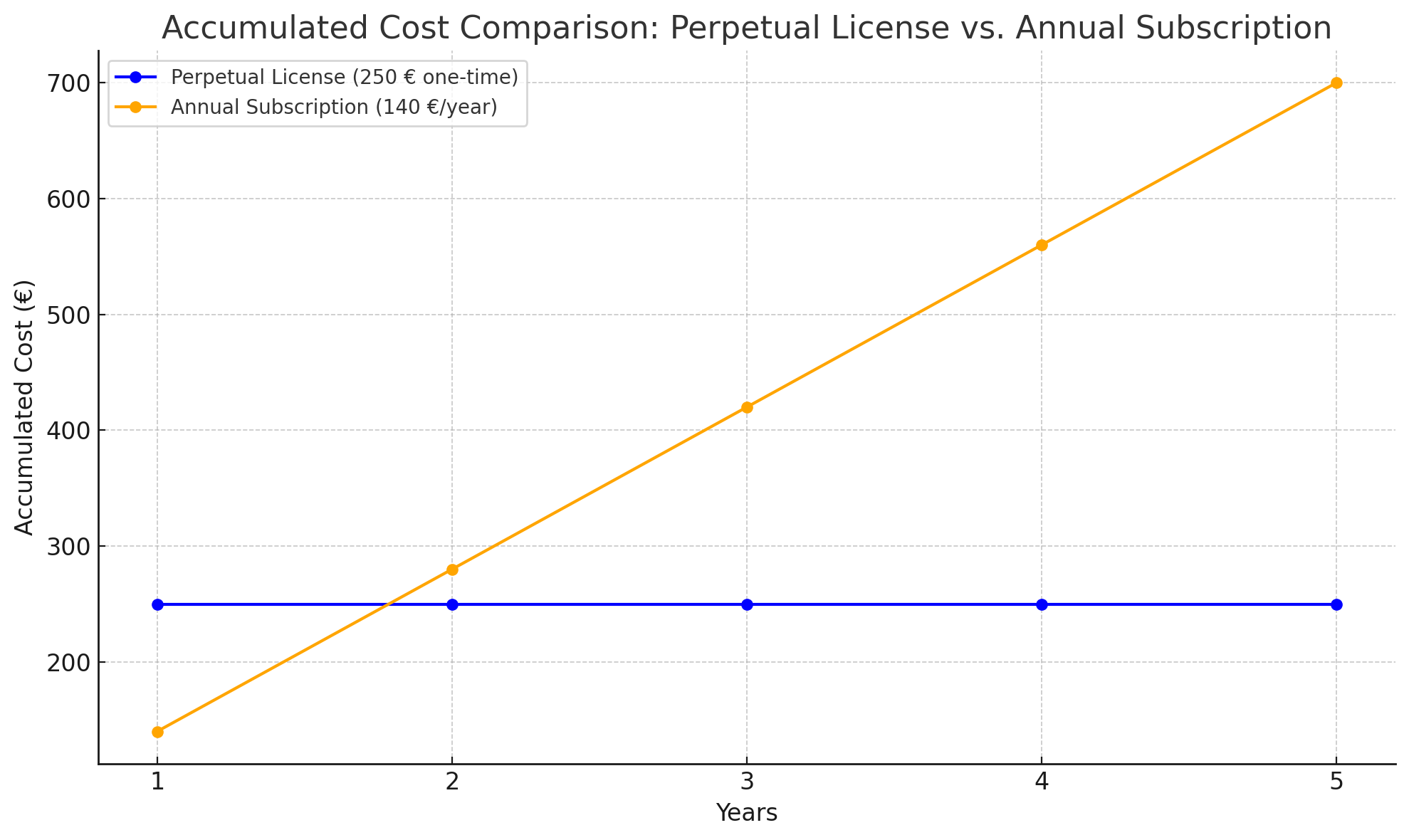 Figure: Accumulated cost comparison between a one-time perpetual license (blue line) and an annual subscription (orange line) over 5 years. In this simplified example, the perpetual license costs €250 once, while the subscription is €140 per user per year. Starting from the second year of use, the total cost of the subscription already surpasses that of the perpetual license, illustrating the long-term potential savings of a permanent license.